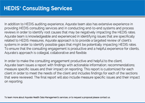 Aqqurate team are experienced in conducting end-to-end systems and process review in order to identify root causes that are negatively impacting the HEDIS rates. Aqurate team is knowledgeable and experienced in identifying issues that are specifically related to HEDIS measures.