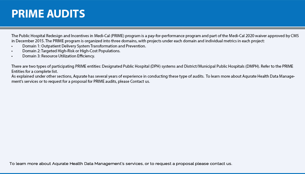 The Public Hospital Redesign and Incentives in Medi-Cal (PRIME) program is a pay-for-performance program and part of the Medi-Cal 2020 waiver approved by CMS in December 2015. The PRIME program is organized into three domains, with projects under each domain and individual metrics in each project: more info